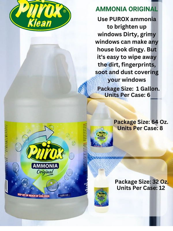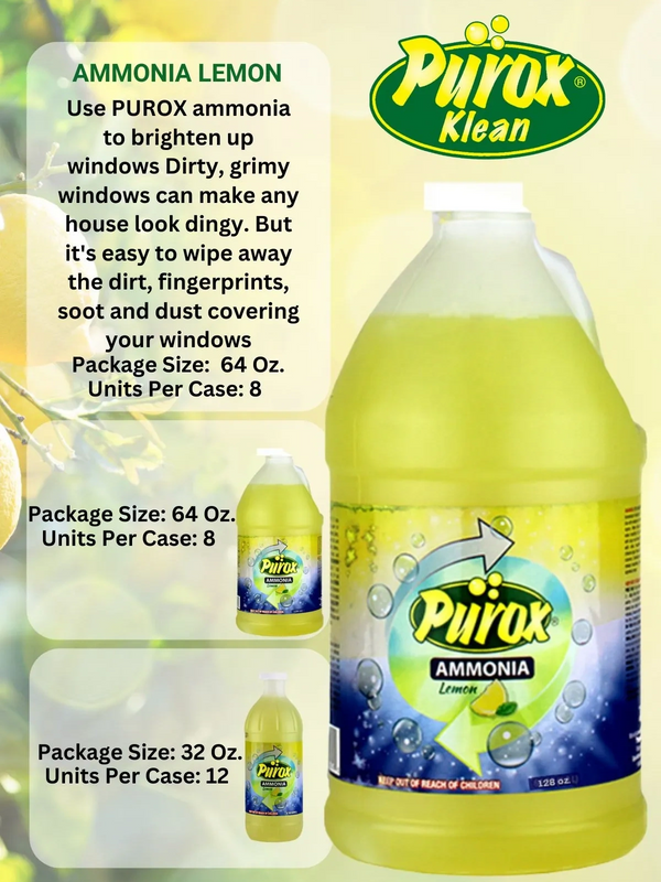 Purox Ammonia Cleaner is a powerful, fast-acting cleaning solution designed to cut through grease, grime, and stubborn dirt on a variety of hard surfaces. Ideal for kitchens, bathrooms, and tiled areas, it leaves surfaces sparkling clean and streak-free. Its strong formula makes it perfect for removing tough stains and buildup, while its fresh scent helps deodorize your space.