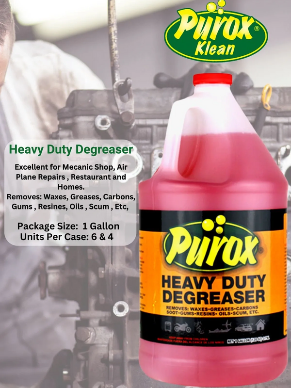 Purox Heavy Duty Degreaser is a powerful industrial-strength cleaner specially formulated to break down and remove tough grease, oil, and grime. Ideal for commercial kitchens, automotive shops, and heavy-use areas, it delivers fast-acting performance on ovens, grills, exhaust hoods, machinery, and concrete floors. Its concentrated formula penetrates buildup quickly, leaving surfaces clean and residue-free.